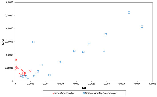 Like sodium, lithium can be considered a relatively well conserved element in solution: it is highly soluble and independent of Ph/oxidation conditions [25]. It does not precipitate in any mineral phase and is not controlled by any biological process. However, it is retained by clay minerals and can even be exchanged with sodium and potassium if the temperature is sufficient to release it from the matrix [26,27]. Its concentration also depends on rock-water interactions and has been used by [28] as an indicator of groundwater residence time. In this case, in contrast to the Br−/Cl− and Na+/Cl− ratios, the Li+/Cl− ratio of shallow aquifer groundwater decreases with increasing Cl− concentration (Figure 7). On the other hand, Li+/Cl− in mine water increases with salinity, like Br−/Cl− and Na+/Cl−. In addition, the high Li+/Cl− ratio in mine groundwater indicates that the origin of the salinity is in the aqueous form.