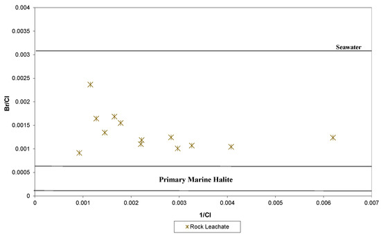 Plot of Br−/Cl− versus 1/Cl− of rock leachate.