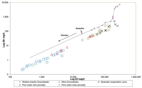 The calculation of the mixing fraction shows that the pore water would contribute about 20% to the mine groundwater sample, with the remaining 80% being fresh meteoric water. The same percentage is obtained for bromide and chloride, reflecting the agreement of the Br/Cl ratio between the porewater and the mine groundwater sample. The same calculation was carried out for all mine groundwater samples in order to check the general validity of this balance for all water samples. The uncertainty in the concentration of the pore water (minimum/maximum) was taken into account in order to estimate the influence of this calculation uncertainty on the determination of the mixing proportions. The results are shown in Table 5. Overall, the results between Cl− and Br− agree for most mine groundwater. The mine’s least saline waters show a minimum mean contribution from meteoric water of about 97% and a slightly different maximum mean contribution of about 98%. The impact of uncertainty on porewater concentration is more evident for the mine’s highly saline water, as the minimum average contribution from the meteoric water is approximately 71%, while the maximum average contribution is approximately 82%.