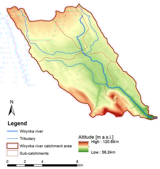 Spatial data are in the form of a digital elevation model (DEM). A DEM was downloaded with a 5 m by 5 m resolution using LIDAR (light detection and ranging). We adopted a DEM to verify the boundaries of the Wirynka river catchment and to study the topography of the land surface.