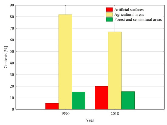 An analysis of the land use map of the Wirynka river catchment from 1990 showed that the catchment was typically agricultural in character. It was observed that the share of the predominant form of use of all elementary catchments was very high and exceeded 80% (except for sub-catchment c2, where the proportion of this form was more than 56%). In 1990, a low percentage was observed for artificial surfaces (urbanized areas), which did not exceed 12% at the scale of each sub-catchment (Figure 4 and Figure 5).
