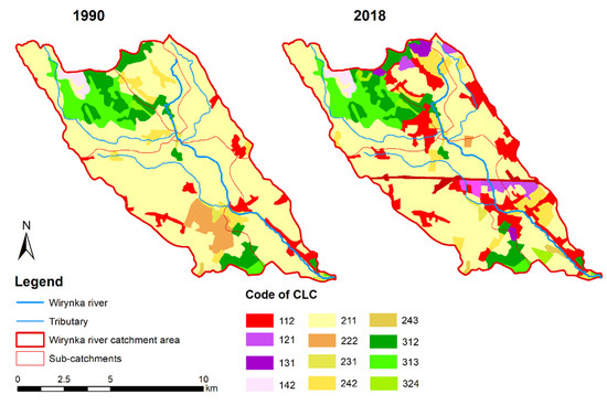 Land use of the Wirynka sub-catchment for two years (1990 and 2018).