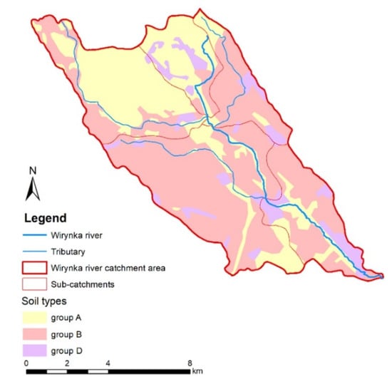 Analyzing the surficial geological structure of the Wirynka catchment in terms of water permeability, it was observed that the dominant soil type was type B, characterized by poor permeability (mainly clay and dust). The area included, to an insignificant extent, areas with high permeability (type A—sands and gravels) and varying permeability (type D—anthropogenic areas). There were no soils in the area classified as group C, i.e., with very poor permeability. The predominant soil type (group B) with poor permeability may contribute to increased rainwater runoff after precipitation events (Figure 6).