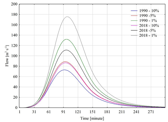 The performed modeling of the amount of water flow that can occur in the Wirynka river as a result of precipitation with probabilities of occurrence (10%, 5%, and 1%) differed between the two study years of 1990 and 2018 (Figure 9). The modeling revealed differences due to spatial changes. Namely, in the case of 2018, which was characterized by higher sealing of the catchment area, higher flows were observed than in 1990, which can occur as a result of the same amount of precipitation. The difference that arose during modeling for both years, at p = 10%, 5%, and 1%, was proportionally 13.5 m3·s−1, 22.4 m3·s−1, and 43.5 m3·s−1. The resulting difference is mainly due to the process of urbanization that has occurred in the catchment area. This is confirmed by Alfy’s research [44], which proved that the ongoing changes in the Wadi Al-Burdi basin also negatively affected the value of modeled and observed flows. For this catchment, an 8% increase in built-up areas was observed, with consequences in excessive river flows.