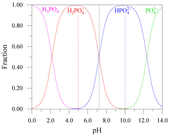The working solutions were prepared based on the composition of a phosphate-concentrated solution resulting from the treatment of a municipal wastewater by electrodialysis [23], with a final phosphate concentration of 0.001 M. The solutions were prepared in deionized and distilled water by dissolving analytical-grade phosphate-containing salts (NaH2PO4·H2O, Na2HPO4, and Na3PO4). The measurements were conducted at pH values of approximately 5, 7.2, and 10, represented by the vertical lines in the speciation diagram shown in Figure 1. Using different pH values made it possible to investigate the influence of pH variation of the bulk solution and the impact of each phosphate species on ionic transport. At pH ≈ 5, around 99.2% of the phosphate ions are available in the single-charged species (H2PO4−), while at pH ≈ 10, approximately 99.4% of phosphate species are double-charged (HPO42−). At pH ≈ pKa2 ≈ 7.2, both H2PO4− and HPO42− are equally proportioned in the solution. Additionally, experiments with 0.01 M and 0.1 M phosphate concentrations were conducted at the neutral pH value (pH 7.2). Information regarding the conductivity of the solutions employed is disclosed in Table 1.