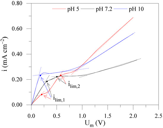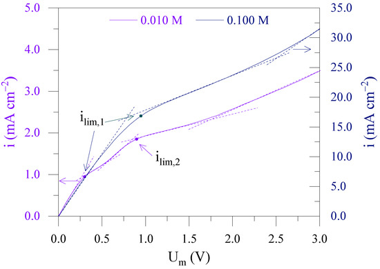 The polarization curves are essential in the analysis of the current–voltage response of an electrolyte-membrane system. Their different regions delimitate significant mass transfer and electrochemistry-related events. A conventional polarization curve obtained with a strong electrolyte can be divided into three well-defined regions [24,25]: (i) at low currents exists a linear relationship between i and Um, showcasing a quasi-ohmic behavior; (ii) then a limiting state is reached, where a notorious increase in the Um values (with the formation of a plateau) attest the escalation of concentration polarization; and (iii) at higher bias, a new increment in the supply of current carriers towards the membrane/solution interface is facilitated by overlimiting mass transfer mechanisms, such as the dissociation of water and electroconvection. For ampholytes, such as phosphate and organic acids, two limiting states in the polarization curve may be reported [12,16,26], and consequently, two limiting current density values can be measured.