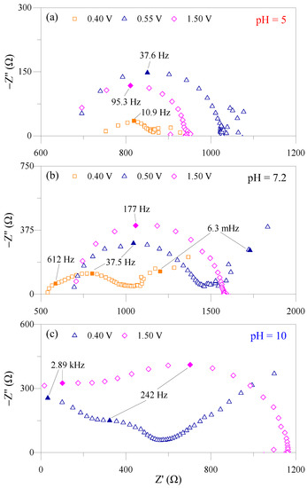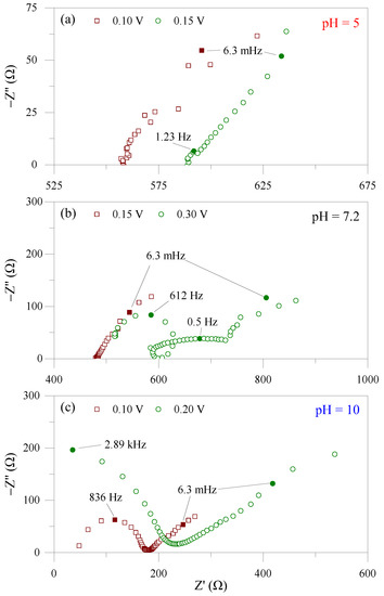 Electrochemical impedance spectroscopy spectra for the 0.001 M HxPO43−x solution at (a) pH 5, (b) pH 7, and (c) pH 10. The impedances were obtained at bias potentials comprehending i < ilim,1 (red) and i = ilim,1 (green) region of the polarization curve. Solid points refer to characteristic frequencies.