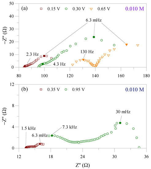 The impedance spectra were also affected by the variation in phosphate concentration, as can be seen in Figure 6 and Figure 7. At potential values corresponding to the i < ilim,1, it can be noted in Figure 6a,b that the increase in the phosphate concentration implies a decrease of the initial ohmic resistance compared to the most diluted solution. Increasing the phosphate concentration also affected the low-frequency arcs, with their pattern leaning towards a finite-length Warburg arc [42]. Upon reaching the first plateau region, applying potential values of 0.30 V and 0.95 V (Figure 6a,b, respectively), the diameter of this Warburg semi-circle presented a significant increase, emphasizing the impacts of concentration polarization effects on diffusive contributions to the overall system response [37].