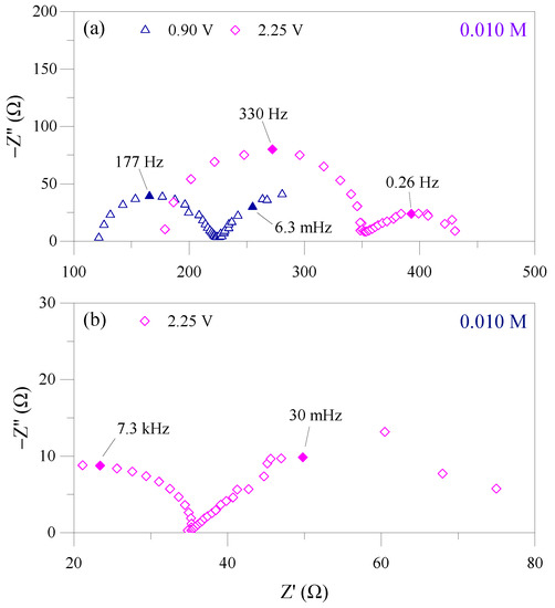 In the range between ilim,1 and ilim,2, a remarkable Gerischer arc can be noted in Figure 6a. The chemical reactions associated with such components in the EIS spectra can generate significant additional current carriers, which can soften the diffusion boundary layer resistance. With the step-up of the bias potential to i ≥ ilim,2 regions, an increase in the dimensions of the Gerischer arc can be observed for the 0.01 M HxPO43−x solution Figure 7a, together with an increase of its characteristic frequency. However, unlike the observed for the most diluted solution, diffusive contributions marked as finite-length Warburg arcs were still present even at such intense electric fields. For the most concentrated solution (Figure 7b), the distribution of the impedance values at overlimiting conditions (i > ilim,1) was comparable to that obtained at lower bias potentials. In this case, the resistance of the system increased with the potential applied, but the thickness of the diffusion boundary layer at 2.25 V was maintained at the same order of magnitude reported for 0.95 V. This can be inferred from the characteristic frequency of the Warburg-type impedances, giving the relation presented in Equation (4) [39].