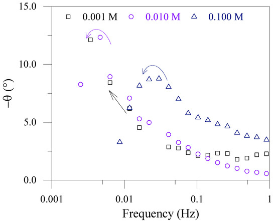 A precise observation of the differences in the distribution of the impedances at low frequencies for the three concentration conditions at pH 7.2 can be seen in Figure 8. The Bode plot of the phase angle () was obtained at bias potentials comprehending the last plateau region of each solution condition (0.50 V for 0.001 M, 0.90 V for 0.01 M and 0.95 V for 0.1 M HxPO43−x). For the 0.001 M solution, where a semi-infinite Warburg-type impedance was reported, a linear increase of the phase angle values can be observed, with showing a continuous raise at low frequencies [42]. When the phosphate concentration is increased, a maximum in the phase angle values is noted at approximately 12° for 0.010 M and 9° for 0.1 M, with the tending again to 0 at the lowest frequencies. These features suggest that an increase in the phosphate concentration may attenuate the effects of additional charge carriers provided by overlimiting mass transport mechanisms, such as phosphate species deprotonation, water splitting, and electroconvection. So, a consolidation of the concentration gradients and, consequently, a better definition of the diffusion boundary layer thickness can be confirmed at increasing electrolyte concentrations.