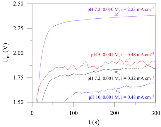 In this regard, Figure 9 presents a section of the chronopotentiograms obtained for 0.001 M and 0.010 M HxPO43−x solutions at current density values higher than the ilim,2. For the most diluted solution, intense undulations in the Um values can be seen in the curves for all pH conditions, especially at pH 5, indicating the occurrence of electroconvection [54,55]. This result is in accordance with the literature, where it is reported that electroconvection is generally the dominant overlimiting mass transport mechanism in diluted solutions, usually lower than 0.02 M [25,53]. However, the chronopotentiometry curve for the 0.010 M HxPO43−x solution presented a smooth evolution, indicating the attenuation of the instabilities induced by the electrical vortices near the membrane surface. This occurrence confirms the development of the diffusion boundary layer with a well-defined thickness.
