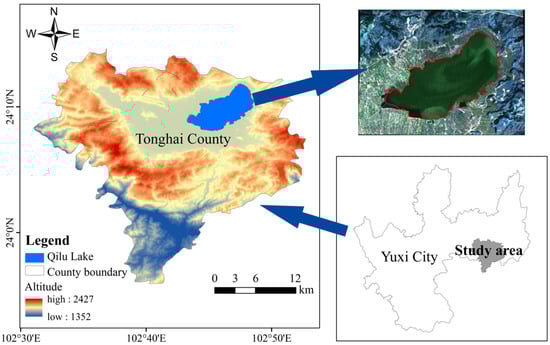 Qilu Lake (102°33′48″~102°52′36″ E, 24°4′36″~24°14′2″ N) is located in Tonghai County, Yuxi City, Yunnan Province, China, with an altitude of about 1796.62 m. It is one of the nine plateau lakes in Yunnan Province (Figure 1), serves as an important water resource in Tonghai County, and has many functions such as industrial and agricultural production water, regulation and storage, flood prevention, tourism, shipping, aquaculture, and climate regulation, etc. [23,31]. Qilu Lake is a closed fault sink lake of catchment runoff type, belonging to the Xijiang River system of the Pearl River basin. The long axis of the lake is east–west. The ancient Qilu Lake occupies the whole Tonghai Basin, and the lake surface elevation reaches 2000 m above sea level. However, after a long history of evolution, its water level drops and the lake surface gradually shrinks. Qilu Lake basin belongs to the humid plateau monsoon climate zone in the middle subtropical zone. The average annual rainfall in the county is 898 mm, of which the rainy season is from May to October, mainly supplied by precipitation. The drainage basin is mainly composed of mountains and dam areas. The dam area is the main production area of grain and cash crops in the county, and is also the main residential area of Tonghai County. It is one of the most densely populated drainage basins among the nine lakes in Yunnan [32,33,34,35,36].