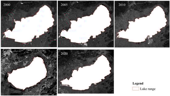 The MNDWI water index method was used to extract the water body of the five-stage Landsat image, and the optimal segmentation threshold for lake extraction was determined by combining the Otsu algorithm and the debris was combined or rejected. The Otsu [47] method is an adaptive threshold method that helps eliminate errors caused by erroneous splitting between water and non-water areas caused by artificial thresholds. The extraction results are shown in Figure 5 and the lake area was counted for each year (Table 2). The extraction results are shown in Figure 5.