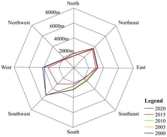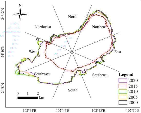 We used the quadrant orientation analysis method in geometry for reference to analyze the spatial change trend of the lake area from eight directions: east, northeast, north, northwest, west, southwest, south, and southeast (Figure 6 and Figure 7, Table 3). On the whole, from 2000 to 2020, the spatial changes of Qilu Lake in all directions showed the characteristics of reduction, especially in the southwest and west, with the area reduced by 0.44 and 0.49 km2, respectively. The second largest reductions were in the north and south. In these two directions, the area of Qilu Lake has shrunk by 0.29 and 0.22 km2. However, the area in other directions decreased slightly, and the northwest direction only decreased by 0.09 km2. Compared with other years, the lake profile in 2015 decreased by 200 m in this direction. From the stage of lake spatial change, except for 2015, the lake contours in other years are roughly consistent with a small change range. From 2000 to 2010, the area of lakes changed steadily. In the early stage, it was mainly reduced, while in the later stage, it was mainly expanded. From 2010 to 2015, Qilu Lake contracted sharply, with a shrinking area of 7.36 km2 in the southwest, accounting for 1/4 of the total area, and a shrinking area of 3.2 km2 in the west. From 2015 to 2020, Qilu Lake will gradually expand, and its area will return to the state close to that before 2015. Its expansion direction is consistent with the reduction direction of the previous stage, mainly reflected in the southwest and west directions. The lake area will increase by 6.82 km2 and 2.8 km2, respectively.