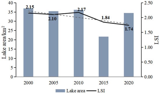 In order to visualize the characteristics of lake contour changes, we used the landscape shape index (LSI) to measure the shape changes of the contour of Qilu Lake from 2000 to 2020. The landscape shape index indicates the ratio of the circumference of a plaque to the circumference of an equal area and is an important indicator for quantifying the complexity of the landscape shape; the larger the value, the more complex the landscape shape and vice versa—the smoother and simpler the shape, when its value is 1, the landscape is round [22,48]. The results show (Figure 8) that the shape index of Qilu Lake has generally shown a downward trend in the past two decades and its changes mainly include two stages: the shape index in the previous stage (2000–2010) is not less than 2.10, which roughly maintains a stable level, first falling and then rising, and the lake contour at this stage maintains the original complexity and is less disturbed by the outside world. In the later stage (2010–2020), the shape index gradually decreased from 2.17 to 1.74, for which the index fell the most from 2010 to 2015, and the lake contour tended to be flat, which was due to the increasingly severe human disturbances such as road damming, water release, and construction of scenic spots around Qilu Lake at this stage, coupled with the uneven distribution of rainwater in the river basin, resulting in low regularity of lake contour changes [22]. There is a certain degree of positive correlation between lake contour and area size change.