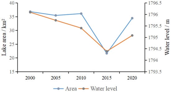 In order to maintain data consistency and reduce errors, we selected the water level data in February of each year corresponding to the remote sensing data used for area extraction to analyze the water level change and its relationship with area change (Figure 10 and Figure 11). From 2000 to 2020, the water level of Qilu Lake showed a decreasing trend and its change was roughly divided into two stages: from 2000 to 2015, the water level of the lake gradually decreased, with the largest drop from 2010 to 2015 reaching 1.01 m. According to the linear regression analysis (Figure 11), we found that the water level change of Qilu Lake was positively related to the area change. Except for small fluctuations, the characteristics of the change trend were generally consistent.