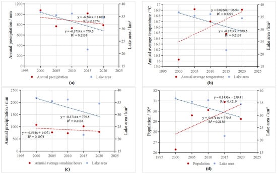 In order to better quantify the driving factors of the changes in Qilu Lake area in the last 20 years, we selected four natural factors, namely annual average temperature, annual precipitation, annual average sunshine hours, and annual average evaporation, and five socio-economic factors, namely population, GDP, gross industrial output value, gross agricultural output value, and crop planting area for analysis. Through the analysis of grey correlation degree [49], it was found that, on the whole, the influence of natural factors on the changes in Qilu Lake area is greater than that of social and economic factors (Table 4). The order of correlation degree of natural factors is: annual average temperature > annual average sunshine hours > annual precipitation > annual evaporation. The order of correlation degree of social and economic factors is: population > crop planting area > total industrial output value > GDP > total agricultural output value. In general, the annual average temperature, annual precipitation, annual average sunshine hours, and population have the greatest impact on the change in the Qilu Lake area. According to the linear analysis results (Figure 12), it can be seen that the annual average temperature (b), annual average sunshine hours (c) and population density (d) are negatively correlated with the lake area, and the population density and annual average temperature are more significant. Annual precipitation was slightly positively correlated with the lake area (a).