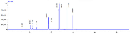 Analyses of the samples were carried out according to EPA method 552.2. After the sample preparation stage was performed by liquid–liquid extraction and derivatization, the detection of HAAs was performed using gas chromatography equipped with a μ-electron capture detector (GC-μ-ECD). EPA method 552.2 is a method capable of detecting HAAs and dalapon in drinking water. Liquid–liquid extractions, derivatization procedures and the use of gas chromatography (GC) are defined in this method. For the extraction of HAAs and dalapon, a 35 mL sample was placed in a 40 mL EPA vial. A 2 mL amount of concentrated H2SO4 was added and shaken to adjust the pH to be <0.5. A further 16 g of sodium sulfate was added, and the vial was shaken for 5 min until it was all dissolved. A 4 mL amount of MTBE was added, and the capped vial was shaken for 2 min. The vial was left for 5 min to achieve phase separation. Then, 3 mL of MTBE was transferred to a 10 mL vial, and 1 mL of 10% H2SO4 in methanol was added. The capped vial was heated in a water bath at 50 °C for 2 h. After the sample had cooled, 4 mL of the saturated sodium bicarbonate solution was added and shaken for 2 min. A 1 mL amount of the MTBE was transferred into amber vials for GC analysis. A recovery study was carried out to determine the effect of different analyte concentrations on the extraction method applied to the samples. To achieve this, HAAs and dalapon at concentrations of 0.1 ng/μL and 1.0 ng/μL were spiked into 35 mL of distilled water, and the extraction procedure was carried out.