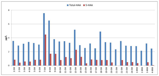 Figure 2 illustrates the concentrations of total HAAs and total 5-HAAs (MCAA, DCAA, TCAA, MBAA, and DBAA). Total HAA concentrations ranged from 2.13 to 7.56 μg/L. The total 5-HAA concentrations varied between <dl-4.47 μg/L. The total 5-HAA concentration was determined at the highest rate in sample 7-SW. MBAA and DCAA, which are among the compounds that make up the 5-HAA group determined by the EPA, were not detected in the bottled water samples. The total 5-HAA concentrations did not exceed the limit value (60 μg/L) given by the EPA. Additionally, MCAA, DCAA, and TCAA did not exceed the limit value (20 μg/L, 50 μg/L, and 100 μg/L, respectively) given by the WHO.