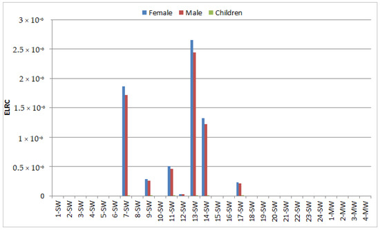 The maximum HQ values for dalapon and TCAA were determined to be 0.12 and 0.0019 in females, 0.11 and 0.0017 in males, and 0.12 and 0.020 in children, respectively. If HQ is more than 1, it may negatively affect human health. If HQ is less than 1, low non-cancer health risks may occur to human health [34]. The non-carcinogenic risk was identified as low for dalapon and TCAA. The non-cancer risk from TCAA was lower than dalapon, and the non-carcinogenic risk was found to be higher in females and children. Figure 3 shows the result of the carcinogenic risk assessment for the TCAA compound. A value of ELRC < 10−6 is considered an acceptable risk; 10−6 < ELRC < 10−4 is considered a tolerable risk and a value of ELRC > 10−4 is considered an unacceptable risk [34,35]. When Figure 3 is examined, an acceptable risk was determined for the 9-SW, 11-SW, 12-SW, and 17-SW samples for males and females. In samples 7-SW, 13-SW, and 14-SW, the risk level exceeded 10−6 and a tolerable risk was determined for males and females. In all samples, the risk is acceptable risk for children. In addition, the level of carcinogenic risk is higher in females than in males. Zhao et al. [36] found an acceptable level of carcinogenic and non-carcinogenic risks for HAAs in drinking water. Gan et al. [22] detected above 10−6 cancer risks for DCAA and TCAA in drinking water.