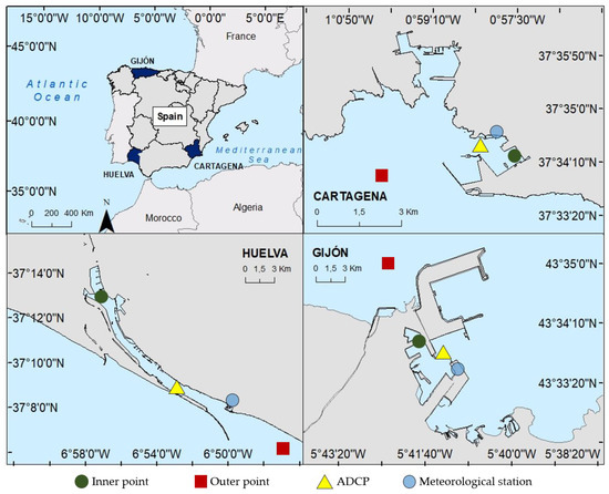 Water currents measurements were obtained by an acoustic doppler current metre (ADCP) in each harbour (AWAC 1MHz model NORTEK-AS). Both have been manufactured by Nortek (Rud, Norway). In Huelva, the ADCP was located inside the estuary where the port begins. Given the complex geometry and the absence of other measuring devices, this work will focus on the first 6 km of the estuary. In Gijón Harbour, it was located at the mouth of the inner Musel Harbour basin, and this work will focus only on this domain. In Cartagena, it was located at the Escombreras basin entrance, and this work will be focused on this basin.