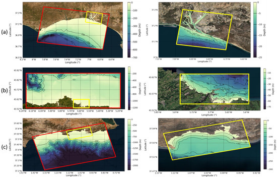 Location and extension of the coastal (red box) and harbour (yellow box) domains in Huelva (a), Gijón (b) and Cartagena (c). The bathymetry of each domain is also shown (yellow corresponds to shallower and dark blue to deeper areas).