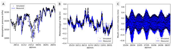 Qualitative analysis of the atmospheric pressure, meteorological tidal, and currents time series (an example is presented in Figure 3) shows the SAMOA model results are in accordance with the observations in all three harbours. This validation is completed in the Supplementary Information document (Figure S1. Time series and scatter plots of model results and observations).