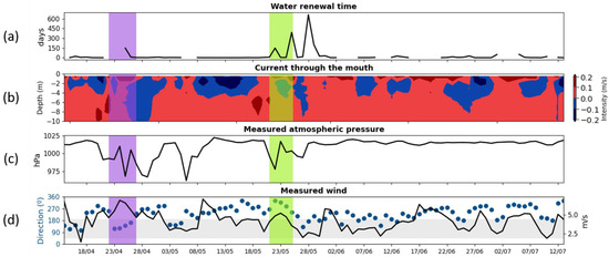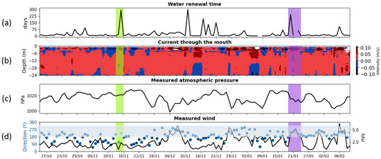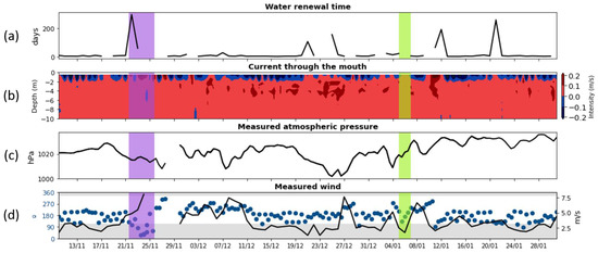 From top to bottom, water renewal time (a), currents at the mouth (b), measured atmospheric pressure (c), and measured wind (d) (the grey shaded area highlights the direction that allows water inflow) on Cartagena’s harbour. The boxes show two examples of high renewal time episodes: the purple one, related to an episode of wind favourable to water inflow, and the green one, linked to an increase in atmospheric pressure.