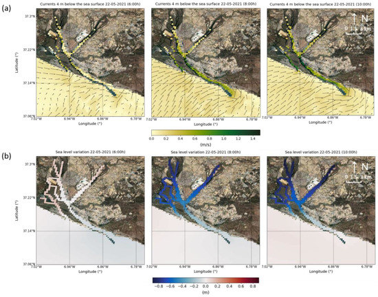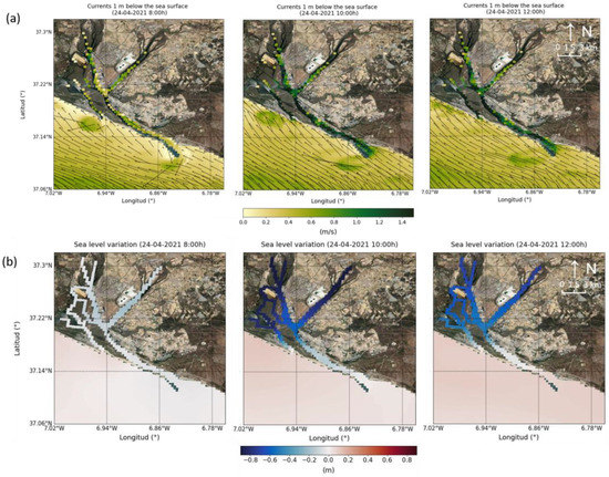 Intensity and direction of the sea currents (a) and sea level variation (b) in the port of Huelva during the southeast wind episode on 24 April 2021.