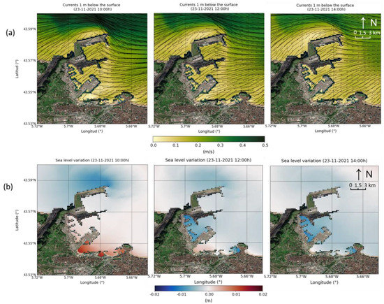 Intensity and direction of the sea currents (a) and sea level variation (b) in the port of Gijón during the northeast wind episode on 23 November 2021.