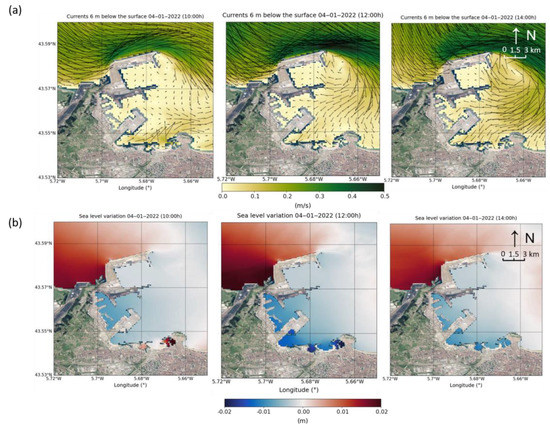 Figure 10 shows the sea level variation in the port of Gijón from the results provided by the model for 4 January 2022. In the figure, it can be seen that the variation in sea level is not equally distributed between the harbour area and the area outside the harbour. In the sheltered area of the harbour, this variation is negative, i.e., the level is decreasing, reaching 2 cm below the mean level. However, in the outermost area and outside the harbour, this variation is positive, reaching 2 cm above. Therefore, a difference in level of up to 4 cm can be observed between the inside and outside of the port.