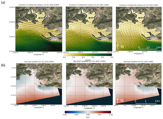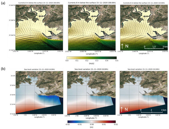 Intensity and direction of the sea currents (a) and sea level variation (b) in the port of Cartagena during the northeast wind episode on 23 November 2021.