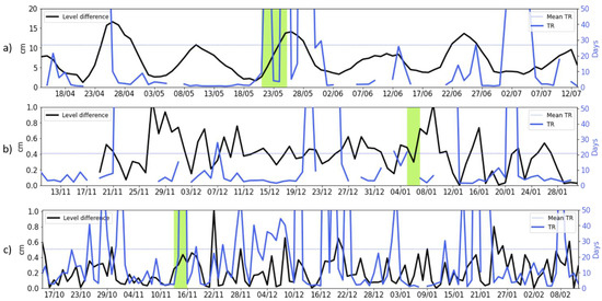 To identify the possible reason for these high inflows, the winds during these events were analysed. It was observed that some of these TR (Renewal time) peaks coincided with wind episodes (vertical purple shades areas in Figure 4a, Figure 5 and Figure 6a) that favoured water inflow (these favourable directions are highlighted by a grey horizontal band). However, others coincided with positive gradients in atmospheric pressure (vertical green shades areas in Figure 4a, Figure 5 and Figure 6a). In other words, some TR peaks (defined as peaks with above-average values) appear to be related to wind events favourable to water inflow and others to increases in atmospheric pressure.