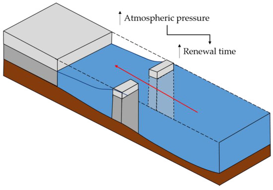 The diagram in Figure 14 summarises the second of the hypotheses: changes in atmospheric pressure generate a difference in level between the interior and the exterior of the port (since the volume of water in the interior is less than that of the open sea) which implies the entry of water and, consequently, an increase in the renewal time. In turn, this increase in the renewal time could lead to a worsening of the quality of the harbour water if these conditions are maintained over time.