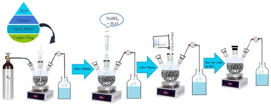 In order to synthesize the nZVI/copper slag nanocomposite, firstly, 10 g of copper slag was mixed with 50 mL of 0.1 M H2SO4 solution and stirred for 3 h at 60 °C. The copper slag was then removed from the acidic solution, washed repeatedly with deionized water and ethanol, and dried in an oven for 15 h at 100 °C. Next, the traditional method of reducing Fe(III) by NaBH4 and using copper slag as a support material was employed to prepare nZVI. In a three-neck flask, 0.8 g of copper slag and FeCl3·6H2O were added to a solution of water and ethanol (20 mL, 3:2 v/v) and stirred with a magnetic stirrer for 20 min at ambient temperature and atmospheric pressure. Subsequently, 1 g of NaBH4 solution in 20 mL of deionized water was gradually added to the flask solution, and the solution was stirred continuously for another 20 min under a pure nitrogen atmosphere to prevent oxidation of the adsorbent. The resulting black and white foul was then washed thoroughly with a 50 mL, 3:2 v/v water/ethanol solution to remove any impurities and dried for 24 h at 60 °C in an N2 atmosphere to prevent oxidation and efficiency loss. Finally, the manufactured adsorbent was placed in a lidded container to maintain its quality. Figure 1 shows the synthesis process of the nZVI/copper slag nanocomposite.