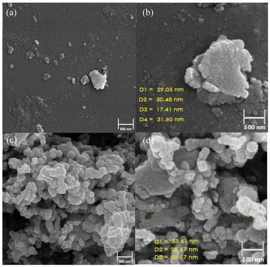 where K is a shape index with the assistance of an amount close to unity, λ is the wavelength of the X-ray emitted to the sample (0.15406 nm), θ is the Bragg diffraction angle, and β is the line broadening at half the maximum intensity. Additionally, the crystalline size was determined at 30 nm, which is explained by the FE-SEM findings. Finally, the amounts revealed were less than the average nZVI crystallite size, such as 59.08 nm [], 72 nm [], and 42 nm []. Generally, these characteristics lead to a boost in the performance of the manufactured adsorbent.