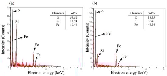 The EDX analysis was used to investigate the elemental composition of the nZVI/CS nanocomposite. The results showed the presence of major elements such as oxygen (O), iron (Fe), and silicon (Si), as seen in Figure 3. The experimental results revealed that the addition of nZVI increased the iron weight percentage (wt.%) in CS from 19.46% to 44.71%. This suggests that nZVI was successfully loaded onto the CS structure. The XRD measurements also provided further evidence to support these findings. In comparison to other adsorbents, the nZVI/CS nanocomposite had a higher iron weight percentage: Mof-nZVI (16.7%) [], d-nZVI (8.61%) [], kaolin-nZVI (20%) [], and AC-nZVI (8.2%) []. Therefore, the nZVI/CS adsorbent performs and removes CFX from aqueous solutions more effectively.
