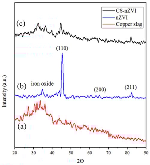 XRD patterns of the (a) pure copper slag, (b) nZVI, and (c) nZVI/copper slag.