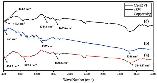 Furthermore, it has been known that the peaks at 3444 and 1635 cm−1 are with respect to the tension of H–O–H on the pure CS surface (Figure 5a) []. Moreover, the peaks at 424 and 867 cm−1 are attributed to Fe-O in Fe2O3 and tension vibration of Si-O of tetrahedrons in silicates present inside pure CS, respectively. As a result, these findings confirmed the outcomes from the EDX experiment and demonstrated the attendance of Fe and Si components together with the pure CS structure. As illustrated in Figure 5c, a novel adsorption peak for different oxide forms of iron at 1384.8 cm−1 is discovered as a result of the nZVI interaction on the CS surface. Generally, the FTIR survey supports the XRD and FE-SEM findings, revealing that the nZVI/CS nanocomposites were profitably prepared.