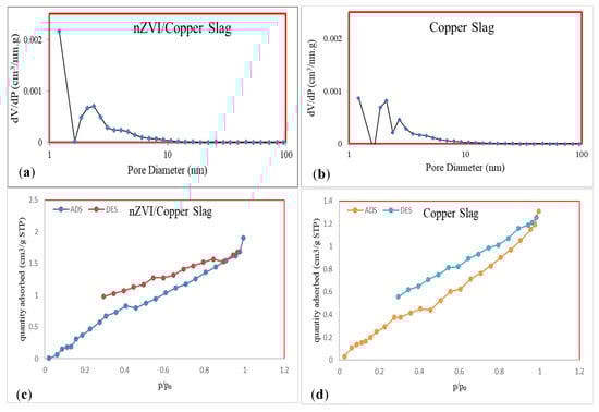Particle size distribution of (a) adsorbent (nZVI/CS) and (b) copper slag and N2 adsorption–desorption isotherm of (c) adsorbent (nZVI/CS) and (d) copper slag. p/p0 is the relative pressure (where p0 = 1 atm and p is the saturated vapor pressure of nitrogen gas at a temperature of 77 K).