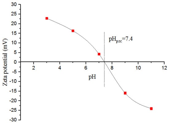 The pHpZC and surface charge for adsorbents at initial pH values ranging from 2 to 10 were measured by constructing a zeta potential diagram, as shown in Figure 7. The diagram was created based on the initial pH of the suspension. It was determined that the pHPZC for the nZVI/CS nanocomposite is 7.4. At acidic pH, multiple H+ cations are present and can be adsorbed onto the surface of the nanocomposite, resulting in an accumulation of (+) charges. In this condition, non-homogeneous ions are expected to be adsorbed onto the nanocomposite surface. In contrast, when the pH exceeds the pHPZC, the adsorbent surface becomes negatively charged because the H+ concentration decreases and the surface concentration of OH− anions increases.