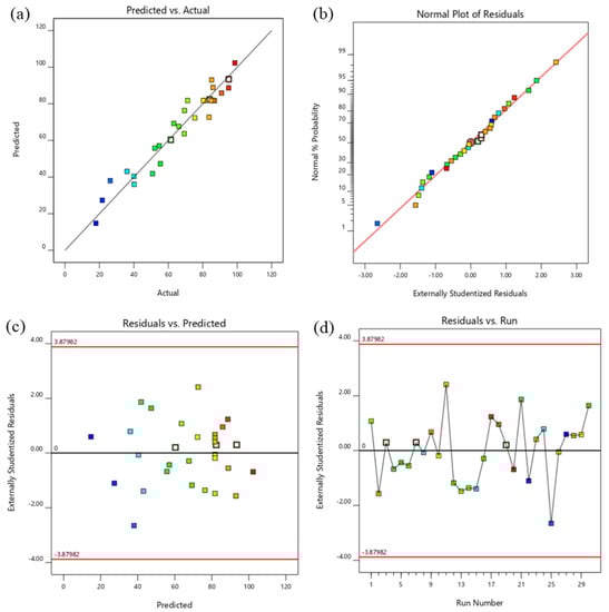 (a) Predicted vs. Actual plot, (b) Normal plot of Residuals, (c) Residuals vs. Predicted plot, and (d) Residuals vs. Run plot.