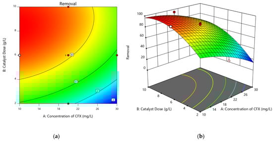 Diagrams of (a) 3D surface and (b) contour of the effect of pollutant concentration and adsorbent dosage on cefixime removal.
