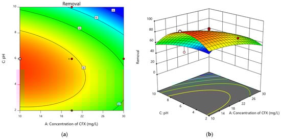 Diagrams of (a) three-dimensional and (b) contour of the effect of pollutant concentration and pH on cefixime removal.