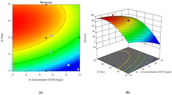 Figure 11 illustrates the interaction between the initial concentration of cefixime and contact time on its elimination efficiency. The figure shows that as the contact time increased from 20 to 40 min, the removal rate increased from 69.27% to 85.96%, with a slower rate of removal, whereas from 30 to 50 min, the removal percentage increased from 84.88% to 90.89%, showing a decreasing rate of cefixime removal. The results indicate that the removal of cefixime has an inverse relationship with time and initial concentration, as the removal percentage decreases as the pollutant concentration increases during the fixed contact duration. At high concentrations, the active areas of the absorbent surface become saturated and filled, resulting in a decrease in removal. Figure 11a shows the contour diagram, while Figure 11b illustrates the three-dimensional plot based on the interaction between the initial cefixime concentration and contact time. Due to the low concentration of the pollutant and the high contact duration, the number of adsorptions increases, and the percentage of elimination increases with increasing starting cefixime concentration. However, by decreasing the contact time, the elimination percentage decreases significantly since, at the beginning of the reaction, there is no progress in the elimination process due to insufficient active surface in the solution.