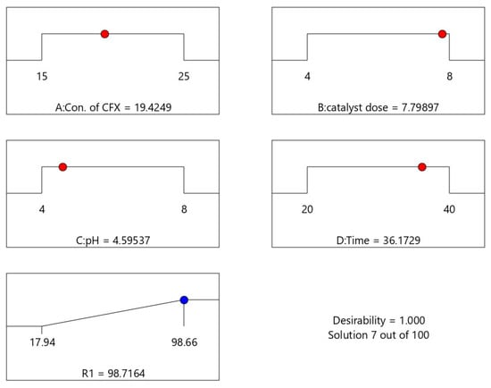 Equation (4) was solved using Microsoft Excel’s Solver Add-Ins. This equation was used to predict the values required for achieving the highest level of CFX efficiency (the optimization outcome), which is displayed in Figure 8a. To study the model’s suitability for response prediction, the optimized projected value was evaluated under real test and operational conditions. The calculated average outcome of three repeats of the real cefixime elimination rate was then investigated, which resulted in a rate of 99.69%. The plots in Figure 8 from a to d verify the results obtained from the software.