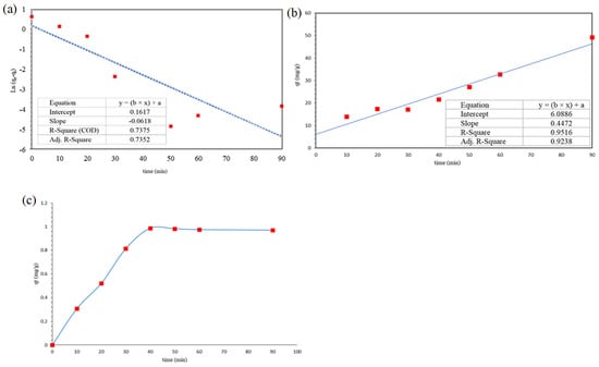 One of the key analyses for measuring the rate of the limiting mechanism and the rate constant of CFX adsorption from aqueous solution by nZVI/CS is adsorption kinetic. The adsorption results were analyzed using the widely utilized pseudo-first-order Equation (6) and pseudo-second-order Equation (7) kinetic models.