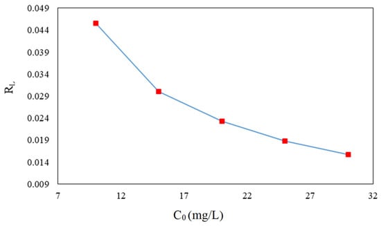 It can be seen in Figure 14 that the computed RL values of the adsorption isotherms of Langmuir at various concentrations of CFX were less than 1, indicating a positive tendency for CFX adsorption on the surface of nZVI/CS nanocomposite. The trend of the graph shows that there is a definite link between RL value and CFX concentration. The more the CFX concentration enhances, the more removal efficiency decreases.