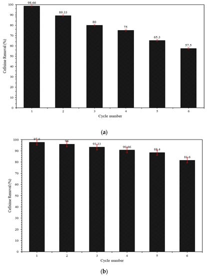 After each cycle, the nanocomposite was separated from the solution with the aid of a centrifuge, and with the assistance of UV-Vis spectroscopy, and the undergraduate pollutant concentration in the solution was determined utilizing UV-Vis spectroscopy. After that, a subsequent cycle was performed using the separated adsorbent without regeneration. The percentage of CFX elimination using nZVI/CS as an adsorbent over the course of six continuous cycles is illustrated in Figure 15a. The outcomes show that the removal percentage of CFX using nZVI/CS significantly decreased from 98.66% to 57.5, which can be attributed to the nZVI being oxidized and the active sites on the surface of the adsorbent becoming saturated. The regeneration process of the nZVI/CS was investigated via the second route (Figure 15b). The adsorbent is regenerated using stirring with a 0.1 M hydrochloric acid solution on a stirrer for two hours following the completion of each cycle. The absorbent was then exposed to nitrogen gas for 24 h to dry it. The goal of washing the absorbent with a diluted acid solution is to dissolve the iron oxyhydroxides that have developed on the surface of the absorbent. In each cycle, a new cefixime solution is used, and the results indicate that the adsorbent performed adequately across a total of six cycles. Therefore, washing with solvent across multiple cycles was more effective and resulted in a higher efficiency of elimination than washing with no treatment or modification.