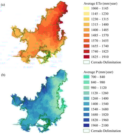 Averages of total annual reference evapotranspiration-ETo (a) and precipitation-P (b) for the Cerrado ottobasins.